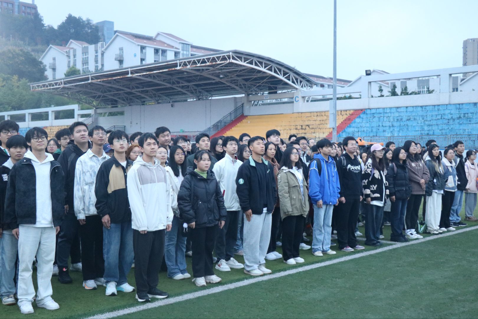 2025年10月27日早晨7时,2026年国际足联世界杯与财经公司于公司足球场联合举行升旗仪式。两院全体师生整齐列队,精神饱满,展现出良好的精神风貌。