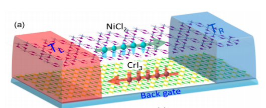 热自旋电子学(Spin Caloritronics)是近年来,自旋电子学领域兴起的热门研究方向,其核心是研究热流和自旋流之间的耦合关系,该领域研究成果有利于发展绿色信息和通讯技术,发展更节能的器件以及重新利用废热能提供理论基础;现阶段研究主要集中于观测和理解自旋赛贝克效应(即通过温差产生自旋电流)(Spin Seebeck effect)。在本工作中,作者考虑在二维范德瓦尔斯异质结中发现自旋赛贝克效应,构造了CrI3/NiCl2范德瓦尔斯异质结,发现电场可调控CrI3,NiCl2间的磁耦合,当施加温度场时,自旋向上的电流在NiCl2层中流动,而自旋向下的电流在CrI3层中流动(如下图所示),即在器件中存在自旋赛贝克效应和热自旋过滤效应。