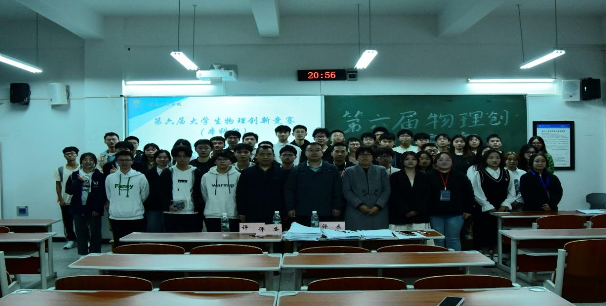 比赛最后,评委老师和参赛选手、现场观众们合影留念,宣告本次第六届老员工物理创新竞赛圆满谢幕。赛后,竞赛组根据评委们对各组公正的评分计算出最终分数。经过紧张激烈的答辩评比共计评选出一等奖1项,二等奖3项,三等奖6项,优胜奖9项;竞赛组委会根据校赛章程将推荐本次校赛中得分前50%的队伍参加重庆市第六届老员工物理创新竞赛。