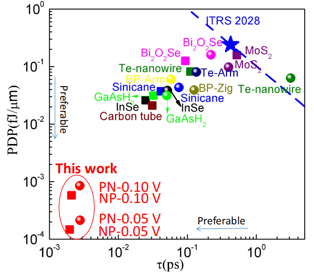 谭教授等计算了器件的功耗延迟积(PDP)和延迟时间(τ),发现其功耗延迟积与延迟时间,显著小于当前报道的所有晶体管。