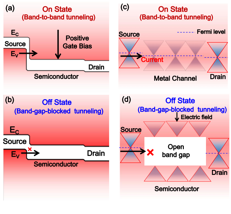 图1. 隧道场效应晶体管原理,开态(a);关态(b)。金属-半导体相变晶体管原理,开态(c):沟道材料为金属;关态(d):沟道材料在外电场作用下变为半导体。