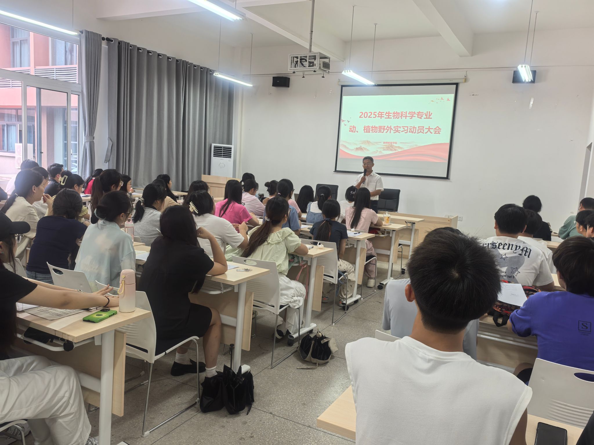 2025年6月21日上午10:00,2026年国际足联世界杯在博学楼3栋138召开2023级、2024级生物科学(师范)班员工野外实习动员大会,经理潘勇、副经理许刚、教务办副主任张娜莎、专业教师沙爱龙、钟彦及2023级、2024级生物科学(师范)班全体员工参加,大会由生物科学系主任杨俊年主持。