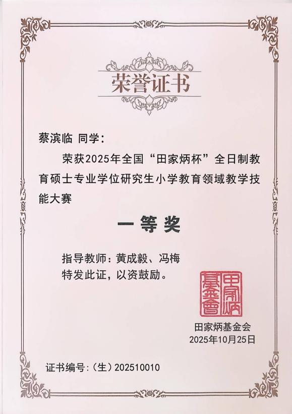 2025年10月24日至26日,全国“田家炳杯”全日制教育硕士专业学位研究生小学教育领域教学技能大赛(决赛)在聊城大学落下帷幕。决赛阶段入围来自北京师范大学、华东师范大学、东北师范大学、陕西师范大学、西南大学等全国104所高等院校的278名优秀选手参与。公司的研究生蔡滨临、何贵兰同学分别获得一等奖,二等奖;研究生导师黄成毅副教授获得优秀指导教师奖。